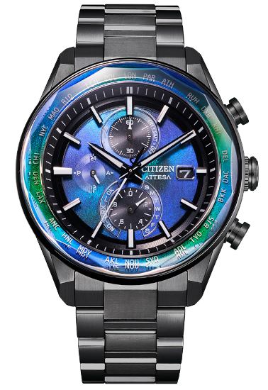 カットされたサファイアガラスの輝きと構造色フィルムが、角度や光のあたり具合で色々な表情を見せてくれます。文字板よりもベゼル側の色合いが明るくて、このコンストラストがより美しく高級感を演出していますね。