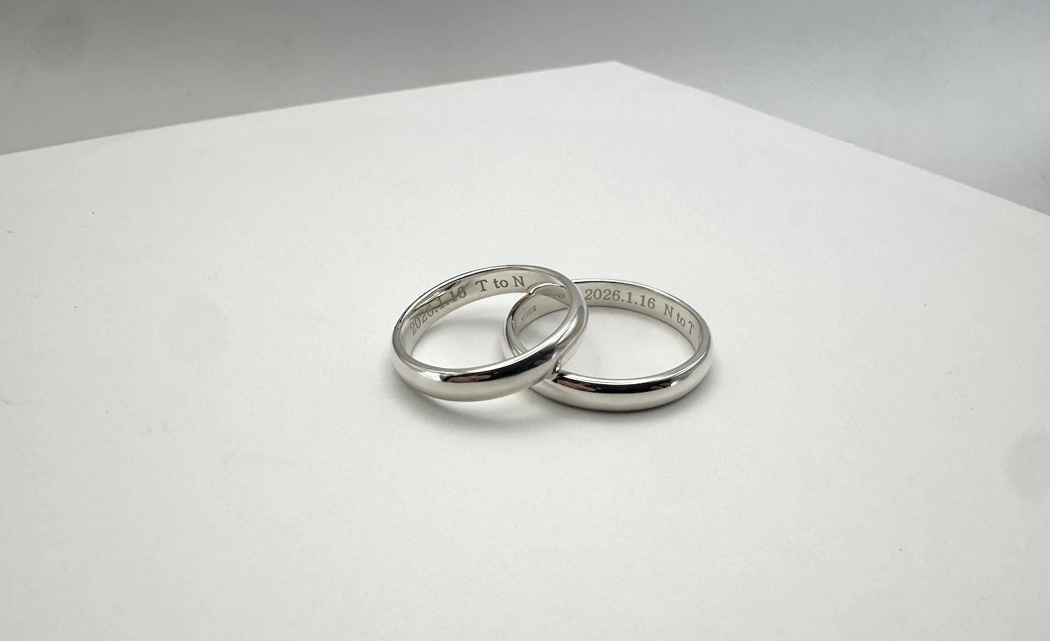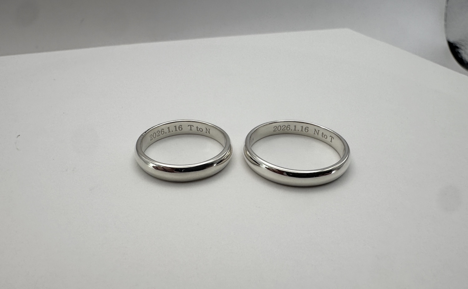 ご希望はシンプルなマリッジリングです。内側には日付とイニシャルの刻印を入れました。